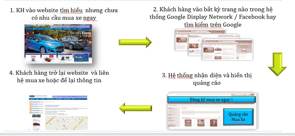 Cụ thể là Google có cài một đoạn mã vào website của bạn, với những khách hàng truy cập vào website, từ quảng cáo hay không, đều được lưu lại vào lược sử danh sách khách hàng. Những dữ liệu khách hàng truy cập được lưu vào trên Google. Chiến dịch sẽ dựa trên dữ liệu; cho hiển thị các mẫu quảng cáo trên Mạng Hiển Thị với các khách hàng này; trên các website khác mà họ truy cập. Nó sẽ theo đuôi họ mãi, không ngừng trên các website khác nhau, tại các vị trí khác nhau. Nó nghe có vẻ hơi khó chịu nhưng rất hiệu quả; vì những khách hàng từng ghé thăm website của bạn, chứng tỏ họ có sự quan tâm tới bạn.