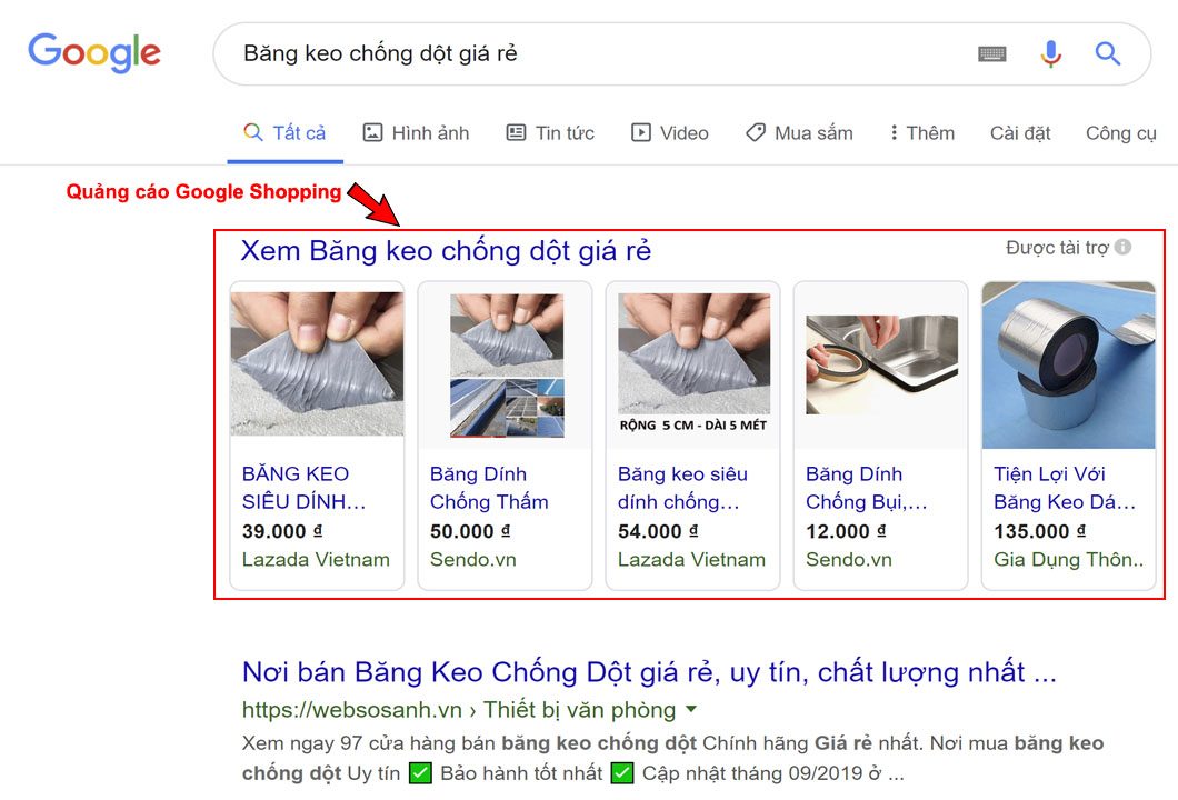 Quảng cáo Google Shopping hay còn gọi là Quảng Cáo Sản Phẩm, đây là hình thức quảng cáo bằng cách đưa danh sách các sản phẩm mà bạn đang kinh doanh trên website lên trang nhất Google, quảng cáo sẽ đi kèm hình ảnh sản phẩm, mô tả và giá bán sẽ giúp khách hàng có sự lựa chọn thích hợp ngay từ trang Google mà không cần nhấp vào trang web. Khách hàng chỉ truy cập trang web nếu họ thật sự ưng ý với sản phẩm của bạn, nên với hình thức quảng cáo này tỷ lệ chốt hàng thành công rất cao.